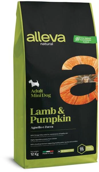 Az Alleva Natural Adult Mini Lamb & Pumpkin egy prémium, hipoallergén receptúra kistestű felnőtt kutyák számára, báránnyal és sütőtökkel. Gabonamentes, kiválóan emészthető formula, amely támogatja az egészséges emésztést és a fényes szőrzetet.