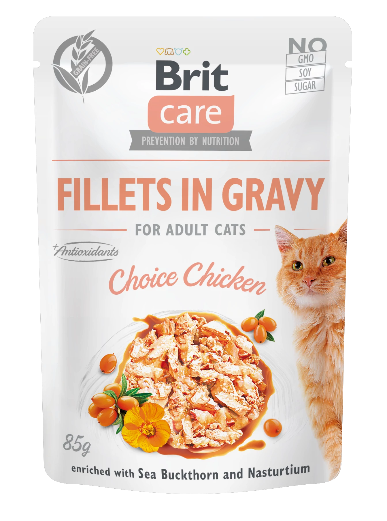 Brit Care Cat Pouch csirkefilé, homoktövissel és sarkantyúkával dúsítva, felnőtt macskák számára.