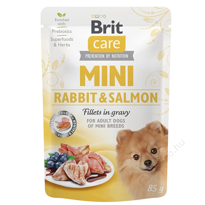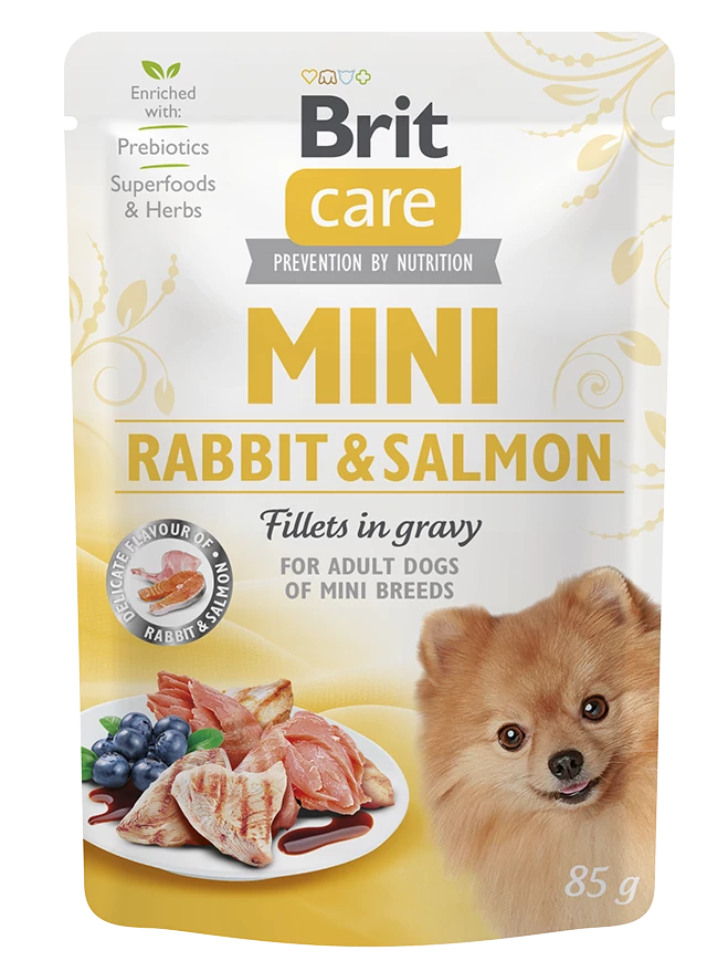 Brit Care Mini Rabbit &Salmon fillets in gravy – Apróra vágott nyúl- és lazac húsdarabok szószban