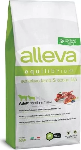 Alleva Equilibrium Lamb & Ocean Fish Medium/Maxi tengeri hallal és báránnyal. Kifejezetten érzékeny emésztésű közepes- és nagytestű kutyáknak készült, válogatott összetevőkből. A hal természetes Omega-3 zsírsav forrás, amely jótékonyan hat kedvenced szőrére és bőrére. Ezen felül D-vitamin valamint kalcium forrás, melyek segítenek kedvenced idegrendszerének és ízületeinek karbantartásában. A bárányhús azon túl, hogy kitűnő fehérjeforrás, vasat tartalmaz, amely hozzájárul kutyád általános jólétéhez. Értékes cink forrás, amely az immunrendszer működéséhez nélkülözhetetlen.