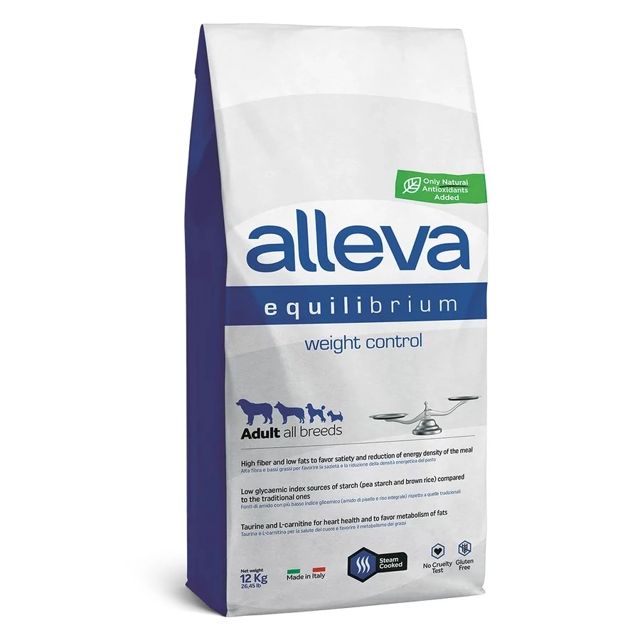 Az Alleva Equilibrium Weight Control mérsékelt fehérje- és zsírtartalmú, válogatott állati forrásokból származó fehérjéket és zsírokat, valamint magas emészthetőségük és gyors energiafelszabadulásuk miatt kiválasztott keményítőforrásokat tartalmaz. Gluténmentes. A receptúrát gyümölcsök, zöldségek és barna rizs hozzáadásával egészítik ki, hogy szabályozzák a glükóz felszabadulását a bélben és meghosszabbítsák a felszívódott energia felhasználását. A formula kifejezetten a súlymegőrzést támogatja. Barna rizs az elsődleges szénhidrát forrás, amelynek alacsony a glikémiás indexe, így segít szabályozni a glükóz felszívódását. Köszönhetően az alacsony zsírtartalmának és a magas rost tartalmának garantáltan alacsony széndhidrátbevitelt eredményez a jóllakottság érzése mellett.