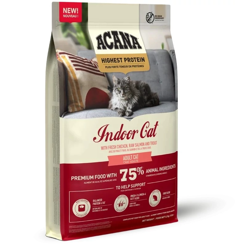 Az ACANA™ Highest Protein Indoor Cat receptúra az első hozzáadott gabonák nélküli Acana eledel lakásban élő macskák számára. Ez a prémium receptúra 75%-ban állati összetevőkből készül, beleértve a szabadon tartott csirkét, pisztrángot és lazacot, hogy kielégítse macskája természetes fehérjeigényét.